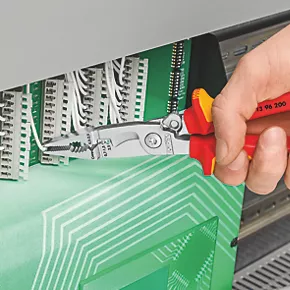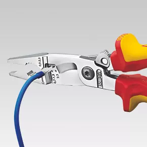 Multiple tools in one unit with 2-component VDE grip for tough, continuous use. Features 15mm cable shears, hole stripping for 1.5 and 2.5mm² wire, deburrs feed-through holes, crimp die for end ferrules 0.5-2.5mm² and grips flat or round materials. Long nose design and smooth jaw perfect for pulling cables without damaging.