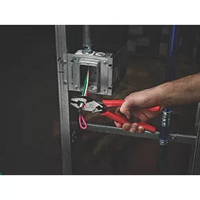 Made from chrome vanadium steel for durability and rust protection, with a serrated gripping zone for strong gripping and pulling. Long handles for maximum cutting power and leverage. Features an on-board crimper for non-insulated and insulated terminals, nail puller and integrated fish tape puller. Iron carbide edges offer durability and the head is ideal for removing burrs from the inside of smooth pipe up to 25mm. Forged for strength and comfort with over-moulded rubber handles which will not peel under jobsite conditions.